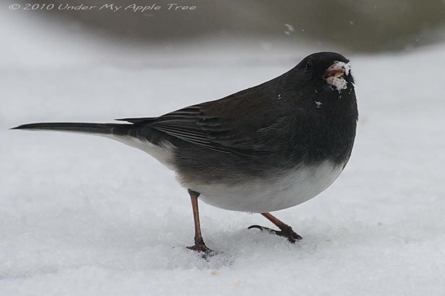 This little Junco walked right up to my back door. He seems happy to be digging in the snow for seeds!