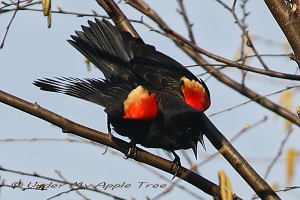 The male is glossy black with brilliant red and yellow patches on his shoulders. I took this photo last spring at my favorite birding spot. Blackbirds were everywhere and singing so loudly they were drowning out the songs of other birds. This guy was desperately trying to attract the attention of a female sitting in the next tree.