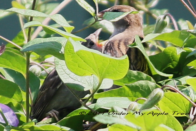 The parents were still feeding these little guys. In this photo you can barely see the mom giving a seed to one of the youngsters who was hiding in the clematis.