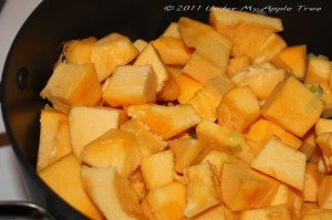 Also, the tip to ‘use a sharp knife’ to skin the pumpkin should be heeded. I had to sharpen my knife to get it to peel the pumpkin’s thick skin. Also, be careful and put the pumpkin on a non-slip surface, such as a towel, to keep it from rolling and to avoid a knife injury.