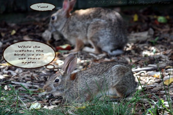 They help themselves to the apples that fall from the tree. The squirrels and some of the larger birds knock them down and the bunnies help me with the clean up!