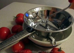 To make the puree I have a very cool hand-operated food mill called the Macina-Legumi that does a wonderful job. That’s a photo of it on the left. It’s a little more work than an electric food mill or blender but I like the results much better. It has three different size strainers and is very versatile.