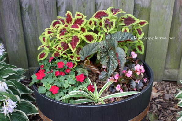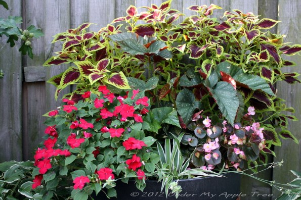 Below is what they looked like in May. The plants in the back are Coleus, on the left are Impatiens, to the right are Begonia, and in the center is Angel Wing Begonia. The green plant in the very front is a piece of Spider plant.