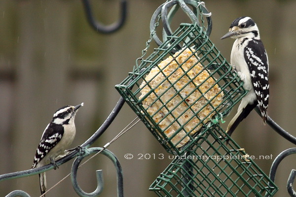 Last summer a Hairy and a Downy stopped by for some suet at the same time providing a rare opportunity to photograph them together.