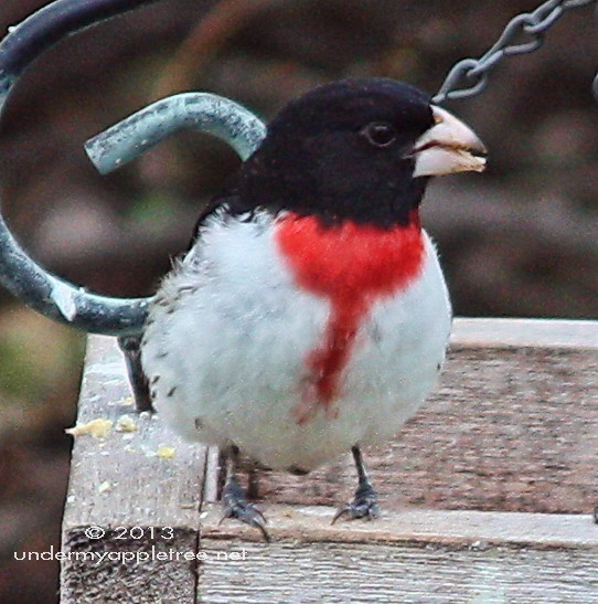 A few weeks ago a male Rose-breasted Grosbeak stopped at my backyard feeders. They are migratory birds and I usually see a few of them in my yard in the spring. They live mostly in the deciduous and mixed forests but are tolerant of people and will sometimes stay in parks and gardens. Last year I watched a pair build a nest on a golf course.