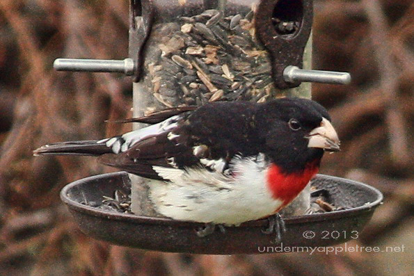 After sampling what I was offering in the tray feeder, Mr. Grosbeak moved on to the sunflower seeds where he happily ate until a noisy Blue Jay showed up and chased him away.