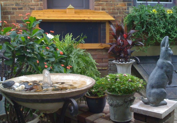 Below is the view of the garden from inside the porch, which is accessed through the laundry room. Our cats, Frankie and Oreo, enjoy warm breezes while watching the birds and squirrels. They’ll often sleep in a slant of sun for hours on end.