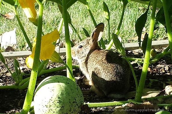 Almost wordless: Many, many bunnies in my yard this summer. Cute, friendly, and destructive! Step away from that squash blossom, young bunny.