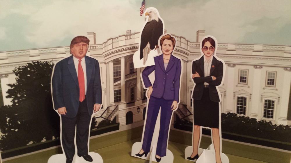The hardcover book includes 10 figures — Hillary, Bill, Republican adversaries, political advisers Oprah and Bono, Supreme Court Justices, plus a few White House ghosts. There are changes of clothing, accessories, and three background scenes. There is also a downloadable bonus page with cutouts of Donald Trump and Bernie Sanders; neither were included in the book because who can predict poiltics!