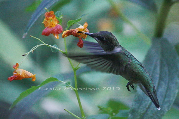 That is one of my favorite photos. I took it during migration and was surrounded by hungry hummingbirds feeding in the jewel weed. Usually they fly away when they see people, but these guys (that is a female in the photo) were feasting on the nectar and didn’t even care I was there.