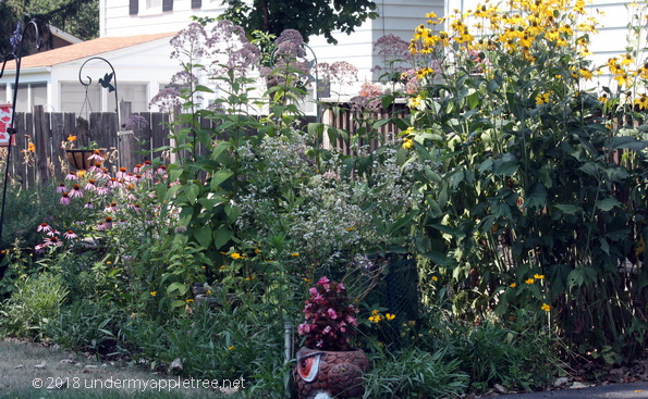 I’m at the mercy of the weather. The tall pink flowers are Joe Pye Weed and will grow anywhere from 3 feet to 6 feet depending on sunshine and amount of water. The Daisy Fleabane are self-seeders and depend on the wind. Most people consider them weeds but I love their delicate look in the garden.