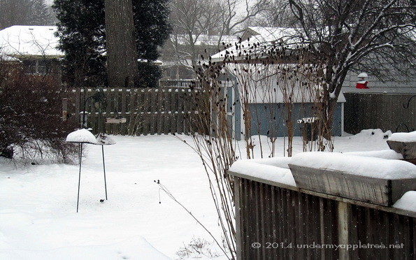 It has been snowing since last night and is predicted to continue snowing through tomorrow. That’s my backyard on the left.
